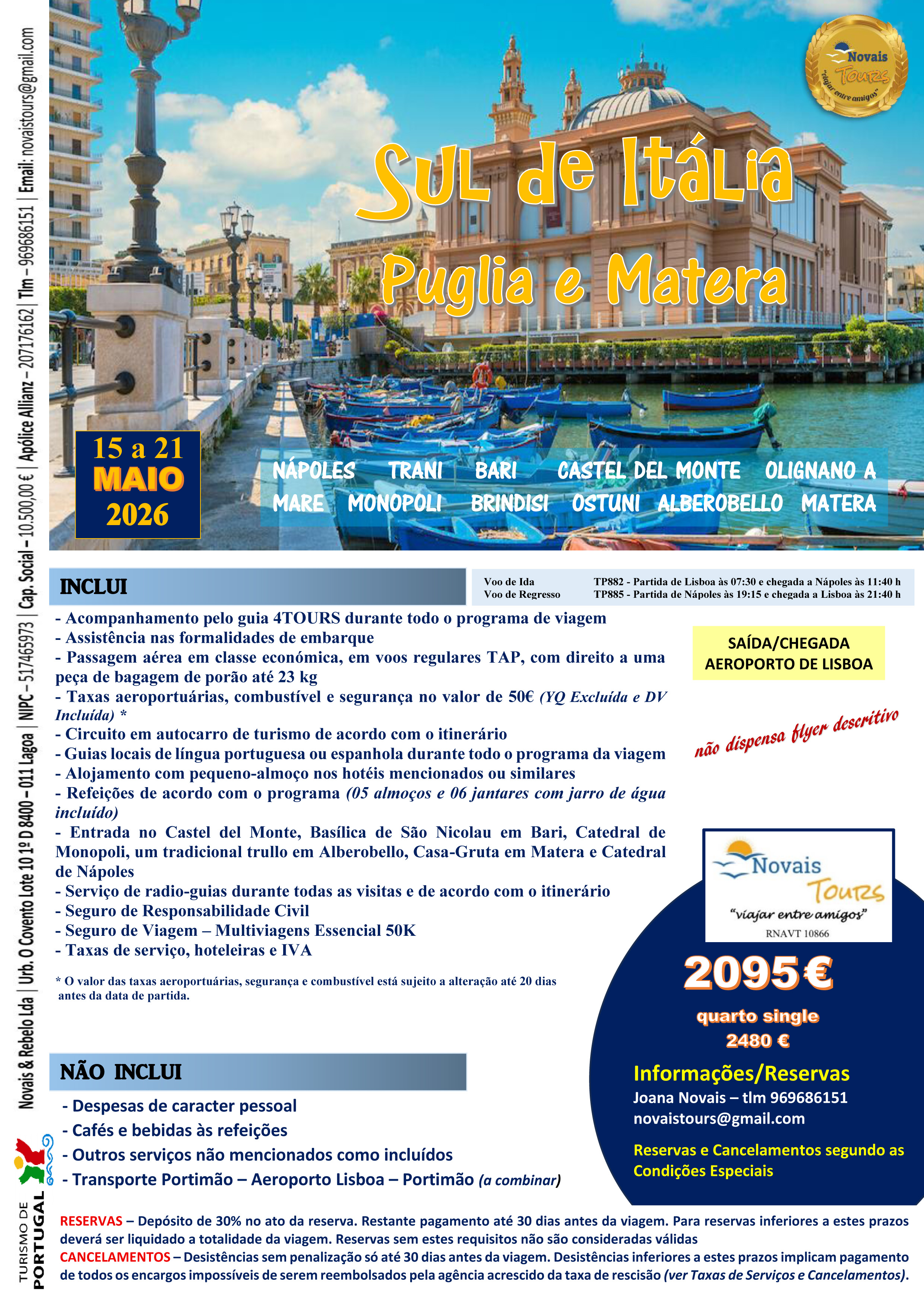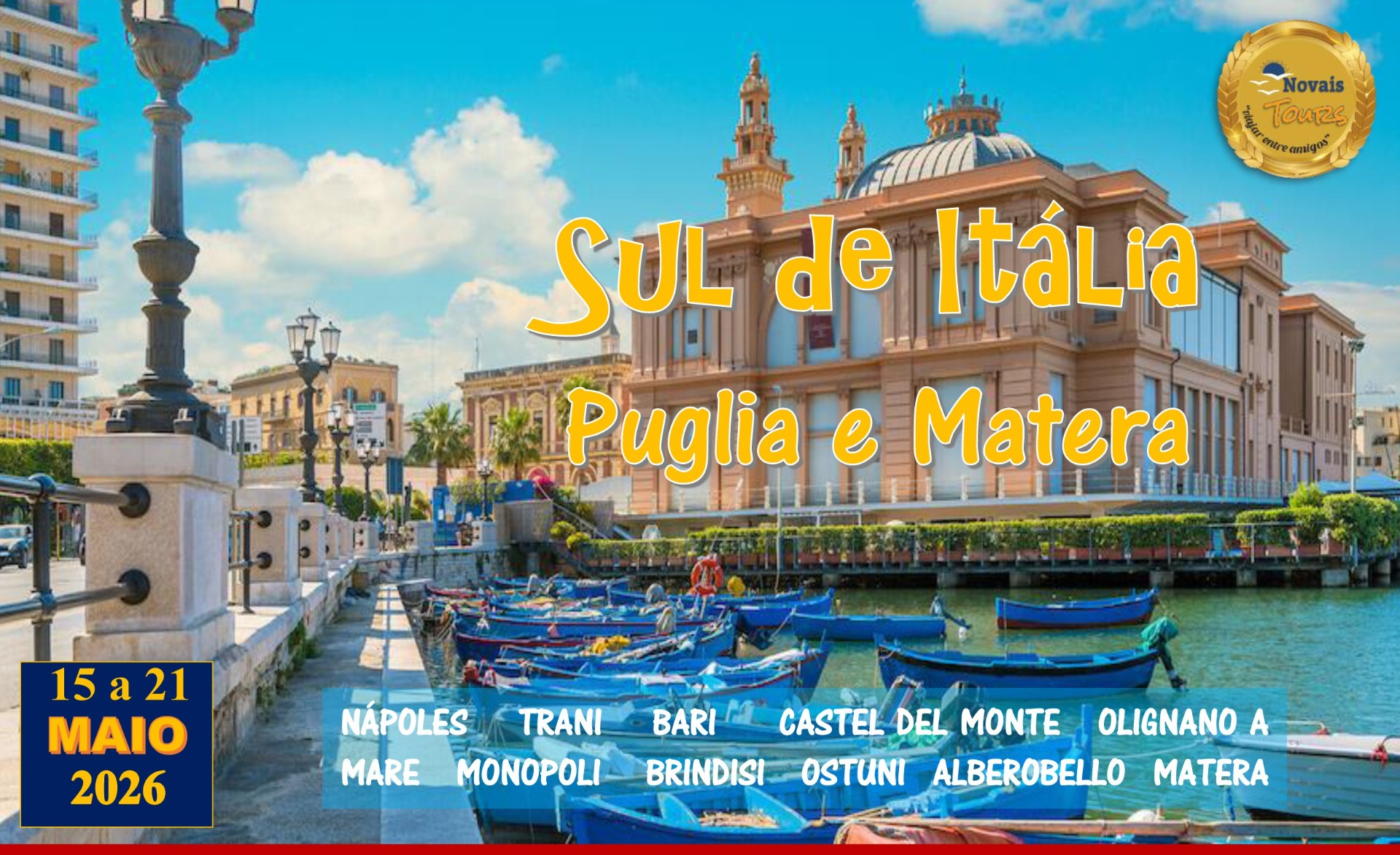 Venha descobrir o lado mais autêntico da Itália! Um roteiro inesquecível que combina a efervescência de Nápoles com a beleza serena da Puglia. Caminhe pelas ruas caiadas de Ostuni, encante-se com os Trulli de Alberobello (Património UNESCO), maravilhe-se com as falésias de Polignano a Mare e os "Sassi" de Matera. De Bari a Brindisi, passando pela arquitetura imponente de Trani e Castel del Monte, prepare-se para sabores intensos, vinhos inesquecíveis e paisagens de sonho.