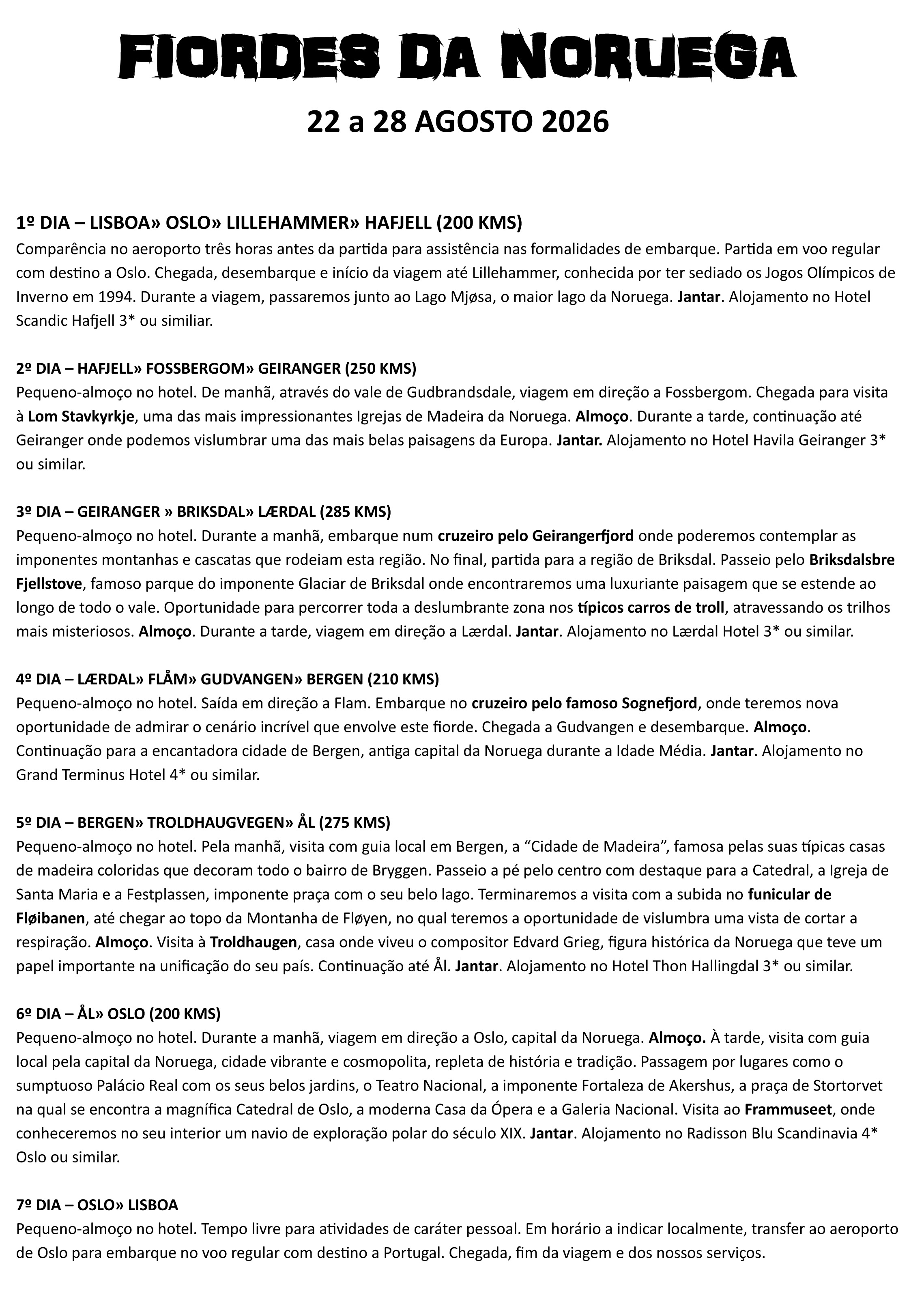 Descubra a grandiosidade dos fiordes noruegueses. Navegue por águas verde-esmeralda, admire cascatas deslumbrantes que descem de montanhas imponentes e perca-se na magia das pitorescas aldeias vikings. Uma viagem inesquecível ao coração da Escandinávia, onde cada paisagem é uma obra de arte.